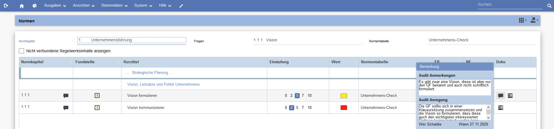 In der Auditansicht können die verknüpften Anforderungen entweder in der Prozessansicht oder in einer Normenliste kommentiert und bewertet werden.